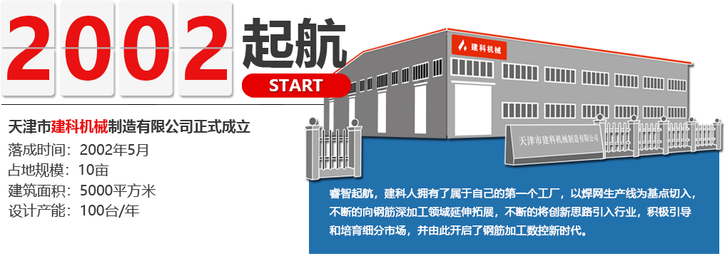 建科智能裝備制造(天津)股份有限公司成立于2002年5月,注冊資金:人民幣130,982,727元,主生產基地占地面積340畝。是中國智能化鋼筋加工裝備行業(yè)首家上市公司和行業(yè)領軍的國家級專精特新“小巨人”、高新技術企業(yè)、國家知識產權示范企業(yè)。